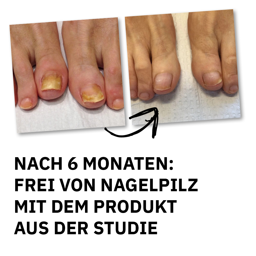 Durchführung: An der Studie nahmen 20 Personen teil, die an leichtem bis mittelschwerem Nagelpilz litten. Sie trugen das Mittel sechs Monate lang täglich auf ihre Nägel auf. Danach folgte eine sechsmonatige Beobachtungsphase ohne weitere Anwendung des Mittels.